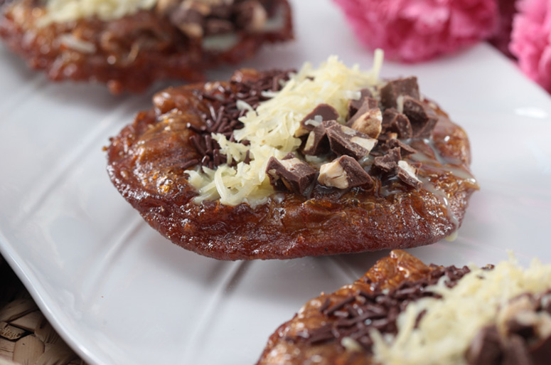 Kali ini, kita akan mengkreasikan olahan cokelat kacang, keju serut, dan susu kental manis yang akan menghiasi lapisan atas kue cucur.