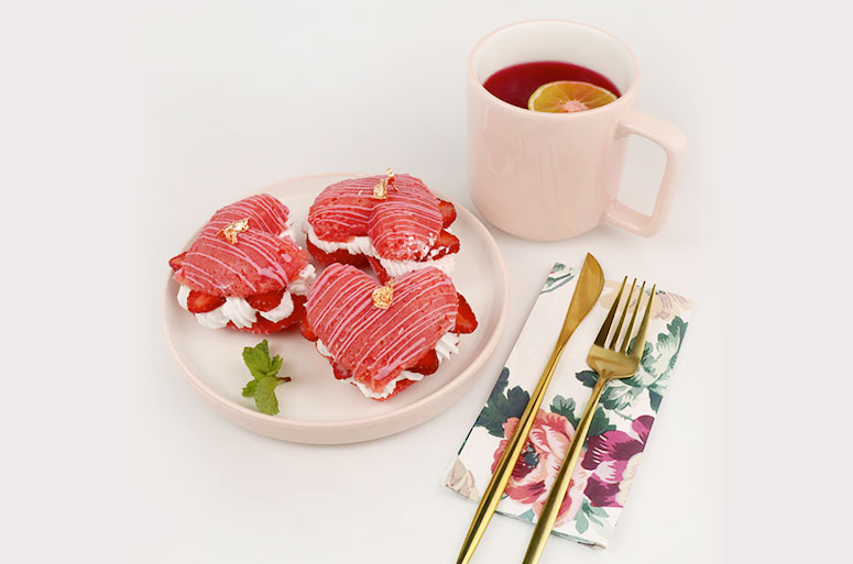 Angkat dan keluarkan dari cetakan biarkan dingin, kemudian siapkan satu bagian dari kue lalu bagian dalamnya isi dengan whipped cream dan potongan strawberry lalu tutup bagian atas dengan kue yang lain dan garnish dengan coklat pink yang sudah dilelehkan, lakukan sampai kue habis.